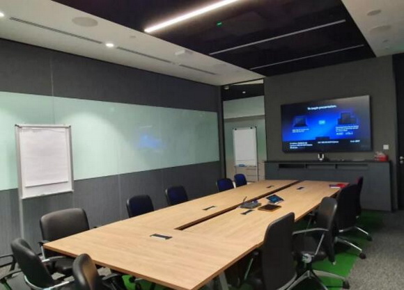 8 間董事會議室、3 間報(bào)告廳和 2 間小型議事間均采用相同的系統(tǒng)設(shè)計(jì)。其中,Extron HC 404 會議協(xié)作系統(tǒng)負(fù)責(zé)將信號傳輸至墻面安裝的 49” 或 55” 平板顯示器。該協(xié)作系統(tǒng)的發(fā)送器具有兩路 HDMI 和 1 路 VGA 輸入,可支持不同信號輸入之間的自動切換,還可對輸入信號進(jìn)行解析度轉(zhuǎn)換,以匹配顯示器的分辨率,提供最佳的圖像質(zhì)量。此外,模擬信號至數(shù)字信號的自動轉(zhuǎn)換和可設(shè)置為后接入優(yōu)先的切換優(yōu)先級模式,也進(jìn)一步簡化了系統(tǒng)的操作。HC 404 接收器的 HDMI 輸入端可連接 Extron ShareLink 250W EU 網(wǎng)關(guān),從而可實(shí)現(xiàn)無線通信。此類緊湊型設(shè)備均可被安裝在顯示器后方,以保持室內(nèi)的整潔美觀。