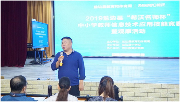 本次競賽活動于11月6日上午在鹽邊階梯教室正式開始,希沃教育研究院陳柯主持本次活動。攀枝花市電化教育(技術裝備)中心廖主任在賽課活動開始前講話:教育部2018年出臺了《教育信息化2.0行動計劃》,現在教育信息化正處于從1.0到2.0發生根本性的變革時期,只有我們主動適應教育的信息化、現代化,才能不斷加強提升自我信息和學科素養,才會有我市和鹽邊縣教育和體育的美好明天。