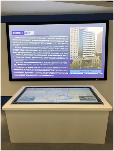 這個區域詳細介紹了中國建設銀行云南省總行現狀,一臺65英寸newline會議平板成為信息檢索中心,通過點擊屏幕,點選銀行的各個部門系統或業務構成,相關的文字與視頻內容馬上就會出現在眼前,讓嘉賓們輕松獲悉中國建設銀行的業務優勢與特色。