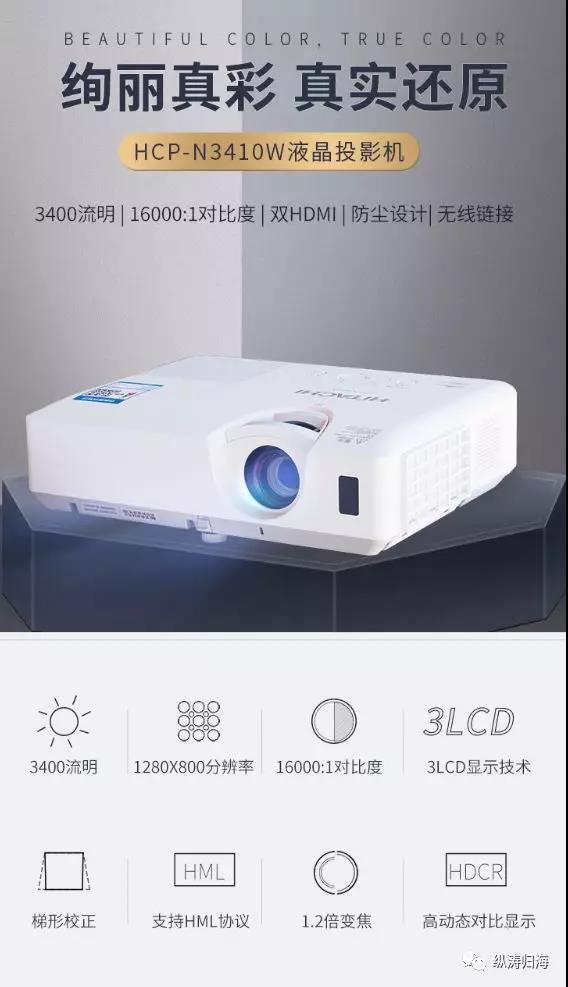 日立HCP-N3410W投影機,商教兩用、其樂無窮;此款機型具備3400流明亮度;1280*800分辨率;16000:1對比度;3LCD顯示技術;現特惠銷售,歡迎咨詢訂購!