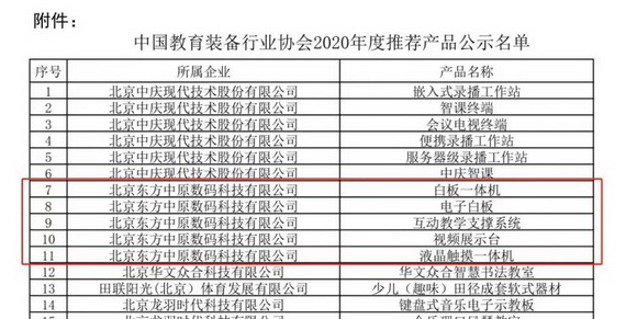 在2020年度推薦產品中,全國共有1060個產品申報評選,層層篩選后最終只有247家企業獲得推薦,東方中原憑借其優秀品質,從一千多個產品中突圍,光榮入選中國教育裝備行業協會2020年度推薦產品。