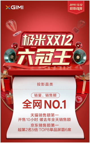 2019年雙12收官,極米科技再創(chuàng)佳績(jī),全網(wǎng)銷量、銷售額均位居第一,實(shí)現(xiàn)雙12六連冠。其中極米在天貓銷售額第一,開售10小時(shí)破去年全天銷售額;同時(shí)京東銷售額超越第2名5倍穩(wěn)居第一,TOP8單品中極米獨(dú)占6席。