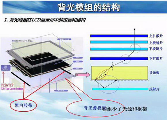 背光源是提供LCD面板的光源。主要由光源、導光板、光學用膜片、塑膠框等組成。背光源具有亮度高,壽命長、發光均勻等特點。目前主要有EL、 CCFL及LED三種背光源類型,依光源分布位置不同則分為側光式和直下式(底背光式)。隨著LCD模組不斷向更亮、更輕、更薄方向發展,側光式CCFL式背光源成為背光源發展的主流。