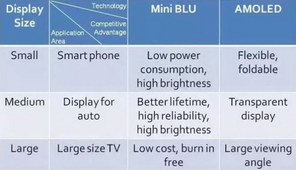 在終端應用上,從小屏幕如手機,PAD,到中屏幕如車載,Monitor,再到大屏幕如TV,Mini BLU與AMOLED都有各自的競爭優勢,一時半會兒可能誰也取代不了誰。特別是在車載,以及中大屏幕顯示上, Mini BLU會有更加明顯的成本優勢以及更好的壽命和可靠性,這些將是目前AMOLED無法取代的優勢。