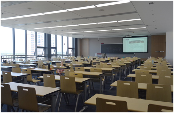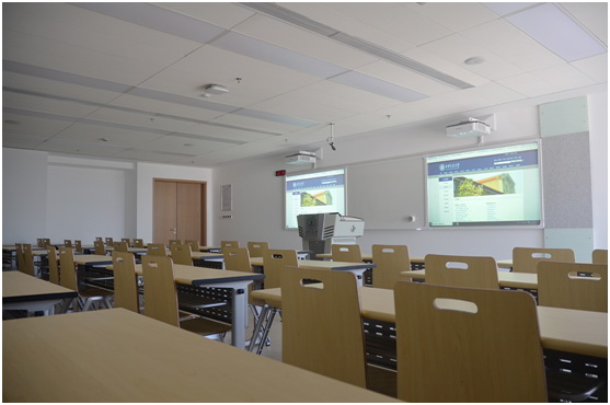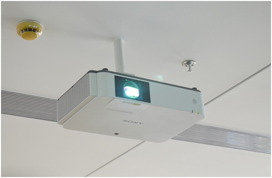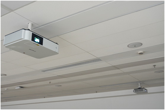 我們首先來到面積最大的授課教室,空間廣闊,一側墻壁完全是落地窗,光線充足。由于空間較大,所以配備了兩臺索尼VPL-P500WZ,在講臺兩側分別投影120英寸畫面。即使白天陽光強烈,室內燈光亦開啟時,教室兩側與后端的學生依然能看清畫面。