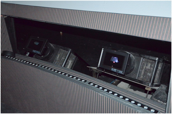 我們先走到“幕后”參觀,6臺VPL-GTZ280分布環繞安裝,在觀眾坐席的正前方與正后方分別有2臺VPL-GTZ280,另外2臺分列于坐席左右。VPL-GTZ280位于屏幕底側,并采用傾仰式安裝,光線不會影響觀眾。