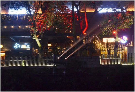 繼續順流而行,兩岸燈光繁華,在善后橋與洞天福地張家沱交匯處,燈光與投影秀利用沱灣獨有的地理優勢將夜游推向高潮。4臺VPL-F1205ZL在河堤上拼融投影了一幅精美的長幅畫卷,影像中水波蕩漾,錦鱗游泳,與溪水倒映成趣。