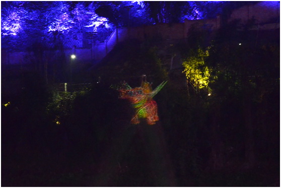 我們乘游船沿釜溪河觀燈覽勝,感受微波拍船的節奏,剛駛出碼頭不久,就來到“群龍山嘯”景觀,這里有兩個展項,每個展項應用2臺索尼VPL-F1205ZL配合長焦鏡頭,在沿岸蔥郁綿延的樹林上投影出自貢市自己的超級IP“時空龍騎士”,逗趣靈活惹人喜愛,帶游客走進“龍之鄉”。