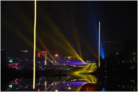泛舟水面,游船從長310米,由415根骨架組成的“龍韻棧橋”景觀邊緩緩駛過,燈光與水霧為河岸蓋上一層朦朧的面紗。游船緩緩停在鐵路橋下,游客們突然發現,位于船兩側的兩根巨大橋墩變成了投影秀巨幕!6臺VPL-F1205ZL投影覆蓋兩個橋墩的大畫面,四五層樓高的動態影像非常震撼,娓娓道來恐龍演化的歷程;畫面倒映水中,與堤岸華燈交相輝映,讓人耳目一新。
