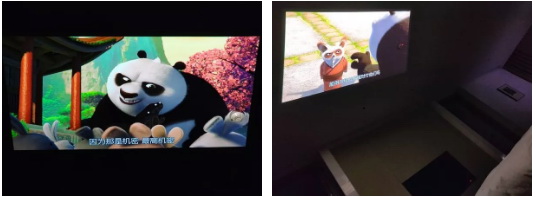 有白天拉上窗簾的情況下,雖然不如夜間畫面清晰,但拍攝時間差不多是中午一天當中光線最強的時候,所以這個環境對于一款便攜投影來說要求嚴格了很多。并且即使是這樣的光線,我們也能發現其實并不影響整體的畫面效果,色彩上沒有太多的失真,清晰度也還不錯,對于辦公還是家用來講這樣的使用效果足夠用了。