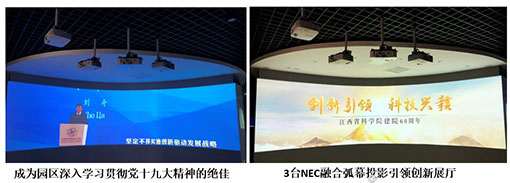 序廳的3臺NEC 商務投影融合弧幕投影應用方案見證了江西省科學院為發展成為國家級重點科學中心和創新高地的不懈努力。展示中心所采用的NEC CF6600U等系列商務投影均采用液晶3LCD技術,輸出的畫面色彩穩定真實,能夠為大中型展覽展示提供清晰的演示畫面。