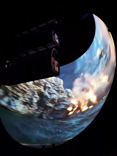 絲路探險區的“鄭和寶船”外觀仿造中國明代著名航海家鄭和下西洋時期的巨船,在船頭與船尾的仿真船艙內分別設有2套碗幕沉浸影院,通過全方位模擬電閃雷鳴、狂風驟雨下逼真的特效影像。該方案在寬達23米的幕上由1臺NEC 40000LM激光工程投影機+定制魚眼鏡頭投射影像,取代了之前多機位融合的方案,不僅僅能保證畫面的一致性,并且省去了大量的后續維護成本,是目前大型球幕、碗幕非常理想的解決方案。