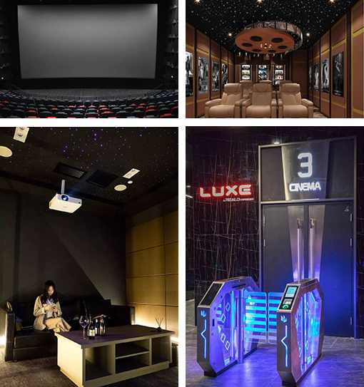 六大影廳包含LUXE巨幕廳、商務廳、多功能廳、親子廳、情侶廳等。這些影廳風格迥異,除了適合不同人群觀影,還可滿足會議、舞臺使用要求。廳內的所有設備,從銀幕、音響器材到座椅,放映機等全部采用國內外最新型、最高端產品。尤其關乎放映質量的放映機,六大影廳全部采用時下性能最優、放映效果最佳的NEC激光放映機,不僅為觀眾帶來了高品質的視覺感受,還為影城節省了運營成本,亮度高、極致防塵、超長壽命這些NEC激光機的強大優勢再次得到驗證。