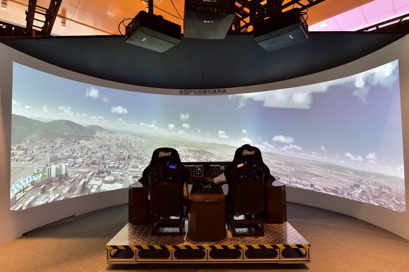 往屆人氣爆棚的國畫飛行模擬視景系統這次實現了全面升級,以3臺LP60SL虛擬仿真投影機投射半徑為3米的180度弧幕,逼真度更高,體驗感更強。國畫虛擬仿真投影機具有動態對比度高、延時短、運動兼容性好等核心優勢,在國內居于領先水平。