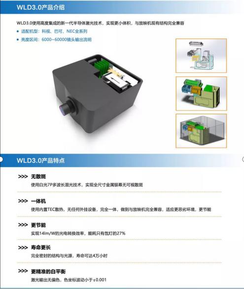 對于影迷而言,走進激光影廳,看一場真正的視覺盛宴已是唾手可得的事。對于影院而言,傳統影廳改激光影廳是大勢所趨。而在市場應用中,大部分產品都是RGB激光光源,其壽命長、色彩豐富的特點,被定義為新一帶投影技術,并被市場所廣泛認可,但是其帶來的散斑問題是影響畫面效果最大困擾。如何消散,如何從源頭消散,像是一片沒有航海圖的水域,只有真正的創新技術,才能繪出航海圖,到達新大陸。正是基于此,白光激光——WLD3.0,無疑是這座橋梁,激光投影的敲門者。白光激光光源技術,完美的解決了傳統激光光源在色域、色溫、色差、光衰等方面的穩定性問題,也解決了許久以來激光放映存在的散斑問題,突破了傳統激光光源的瓶頸,從而推動中國激光光源技術。