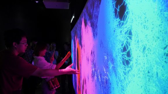 InfoComm現場,索尼采用了最新上市的兩臺6500流明VPL-F640HZ激光工程投影機配以VPLL-Z3003超短焦鏡頭,結合MiTENE 4K AR娛樂互動系統,為觀眾打造了新奇的娛樂互動體驗。人們可用不同的手勢將畫面“打散”直至消失,或引導畫面隨身而動。該展項采用了多臺傳感器,支持多人同時體驗,共享妙趣時刻,參與感十足。