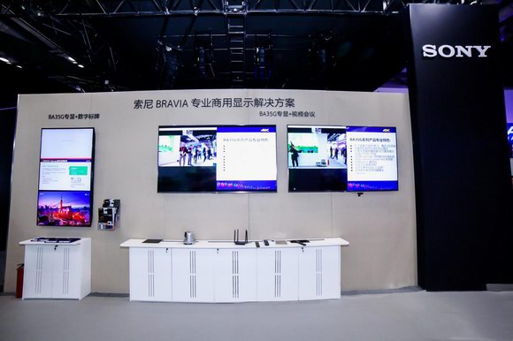 索尼BRAVIA專業商用顯示解決方案展區展出的數字標牌及會議室解決方案,均使用了今年新推出BRAVIA專業商用顯示BA35G系列產品。該系列不僅具備專業商用顯示所需的基本性能,如網絡連接、安裝選項靈活等特點,還配備專業模式(Pro 模式),用戶可根據使用需求定制顯示設置。同時,BA35G系列產品搭載的新型軟件平臺充分利用了內置CPU/GPU和視頻解碼器的性能優勢,將計算機/機頂盒/切換臺的部分性能集成到一臺顯示屏中,系統更加簡化,降低了總體擁有成本。
