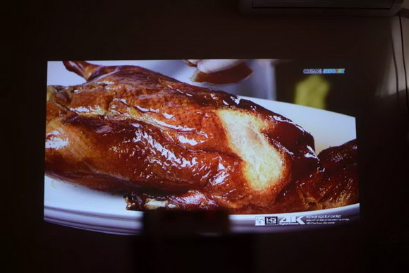 上面我說過這款投影儀是支持4K播放的,大家看到這兩只烤鴨有沒有熟悉的感覺?這個片源就是經常出現在各大賣場里面,給電視播放進行宣傳的烤鴨視頻,清晰度采用的是高清4K,播放出來的效果大家可以直觀的感受一下。