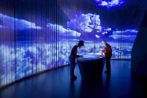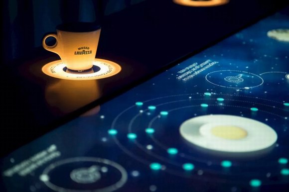 參觀博物館之初,每位游客都會收到一個裝有存儲介質的濃縮咖啡杯。通過將杯子放置在交互式桌面上,可以控制沉浸式360°投影的順序。