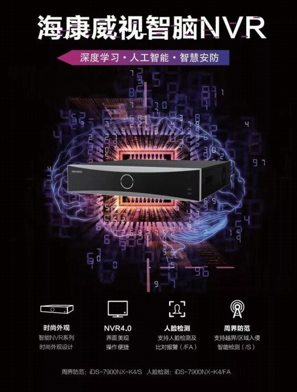 海康威視發布的智腦NVR,周界防范NVR 能對普通攝像機拍攝的視頻畫面進行分析,基于深度學習算法 做到“人體檢測”和“車體檢測” ,自動識別入侵目標,越界偵測后發出警報。人臉識別NVR 能對普通攝像機拍攝到的人臉進行抓拍、建模、比對,實現人臉開門、陌生人報警等功能。
