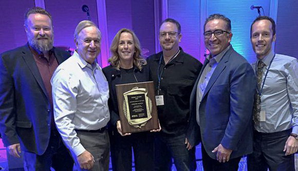 在加拿大多倫多舉行的 ICTA 年度大會(huì)上,ICTA 副總裁 Frank Tees(左一)和總裁 Alan Roe(右一)向科視Christie 頒發(fā)了 ICTA 年度優(yōu)秀制造商獎(jiǎng)(泰迪獎(jiǎng))。上臺(tái)領(lǐng)獎(jiǎng)的是科視Christie 前董事長(zhǎng)兼首席執(zhí)行官 Jack Kline、科視Christie(美洲)電影銷售副總裁 Susie Beiersdorf、電影產(chǎn)品管理副總裁 Brian Claypool、以及科視Christie 電影業(yè)務(wù)發(fā)展高級(jí)總監(jiān) Patrick Artiaga