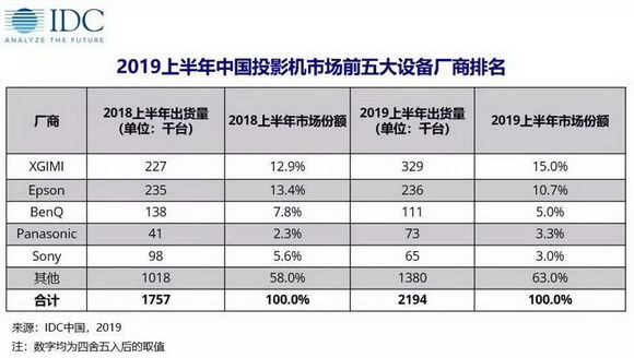 IDC最新發布的《2019年第二季度中國投影機市場跟蹤報告》顯示, 2019年上半年中國投影機市場總出貨量累計達到219萬臺,同比增長24.8%,極米持續領跑。中國家用投影機出貨量突破134萬臺,同比增長54.4%,是投影機行業第一大市場,而LED光源產品更是占據了這一市場份額超過88%。極米科技自2018年第三季度登頂中國投影機市場以來,已連續四個季度位居第一,此次最新數據顯示,其市場份額仍在增長,進一步拉開了與第二名之間的差距。而極米Z6和H2則奪得家用總體市場明星機型冠亞軍。