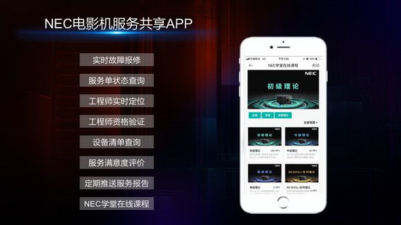 在放映產品上,NEC一馬當先,勇于創新;在售后服務上,NEC更是臻心服務,無微不至。于業內首家推出“NEC電影機服務共享APP”,實現了用戶實時故障報修,服務單狀態查詢,工程師實時定位等多種便捷功能,大大提高了服務效率和質量。近期新上線的“NEC學堂在線課程”模塊,也進一步完善了NEC售后服務體系,幫助客戶實現技能升級,為行業技術人員儲備提供助力。NEC售后服務真正做到了專業、高效、交互。