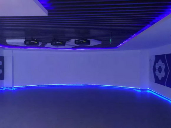 為了實現(xiàn)超大高清畫面,3臺主流投影機(jī)被吊裝于展廳頂部,內(nèi)置多通道融合系統(tǒng),配合先進(jìn)的圖形處理、畫面渲染技術(shù),以正投的方式進(jìn)行3機(jī)弧幕融合,呈現(xiàn)出極具整體感的超大影像畫面。