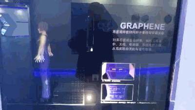 在兩個類似櫥窗的窗口中,集中展示著石墨烯的產(chǎn)品應(yīng)用領(lǐng)域及最新成果,這兩個櫥窗效果正是通過投影機(jī)實現(xiàn)。在明亮的展廳環(huán)境中,成像效果絲毫未受影響,采用全息投影的創(chuàng)意顯示,畫面中物體360°展示期間,如同實物一般呈現(xiàn)在參觀者面前。