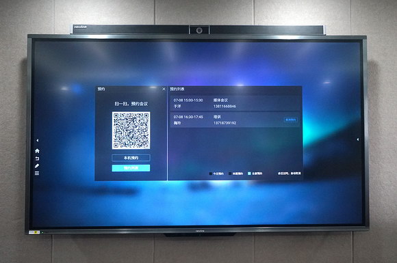 我們要組織一場會議,首先需要預(yù)約,打開newline會議平板上的預(yù)約功能,可以直接進行本機預(yù)約,填入信息即可,也可用手機掃描二維碼預(yù)約,已預(yù)約會議信息顯示在右側(cè)。