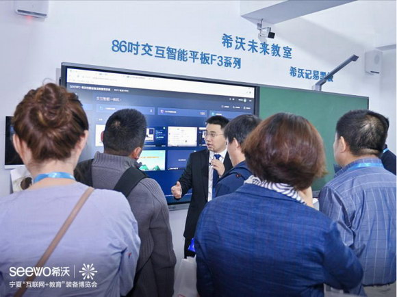 18號下午,寧夏教育信息化的多位主管領導一行人蒞臨希沃展位,仔細聽取了希沃工作人員對搭建常態化智慧教師的整體方案介紹,詳細了解智慧黑板應用的使用方式、特色功能,并提出了針對性的意見。