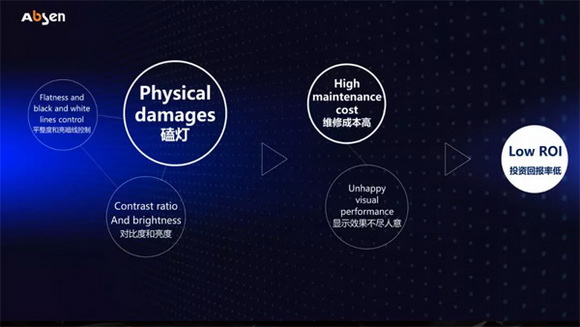 “傳統小間距在租賃應用中出現容易磕燈、顯示效果不盡人意、平整度和亮暗度難以控制、維修成本高等問題。鑒于此,艾比森在行業甚至是全球推出首款IMD四合一MiniLED舞臺顯示設備產品AX系列。”