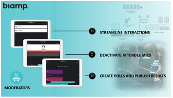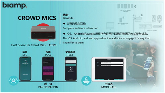 BIAMP最新推出的Crowd Mics™ 使參與活動的觀眾能夠通過智能手機直接發言、進行文字消息推送和投票,為觀眾創造獨特的參與體驗。Crowd Mics 通過消除在房間內傳遞話筒這種需求,實現讓觀眾無縫參與。