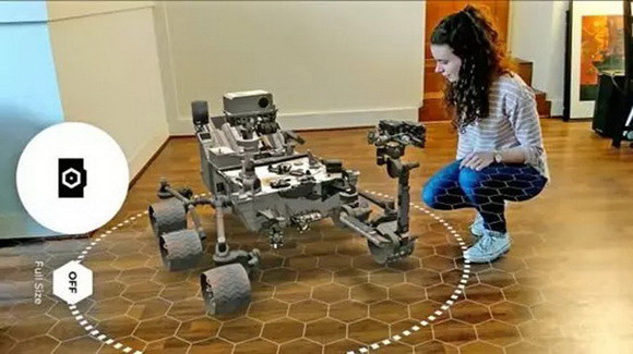 增強現實技術提供了一種身臨其境的學習方式。在上面這張照片中,美國宇航局通過其免費太空飛船AR移動應用程序,將火星“好奇號”機器人呈現在訪問者的客廳中。