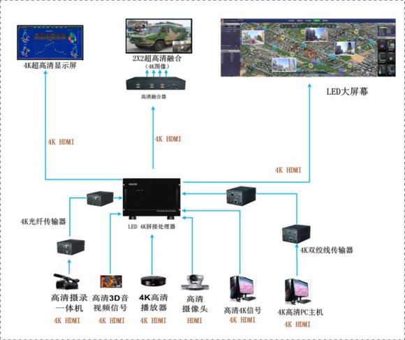 4K拼接處理器支持4K HDMI信號接入,4K HDMI信號輸出拼接顯示。