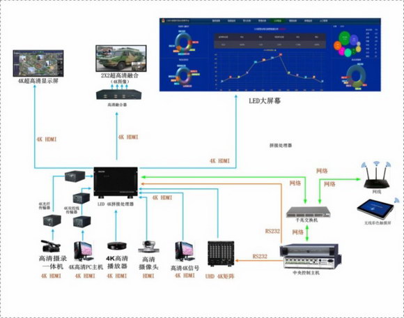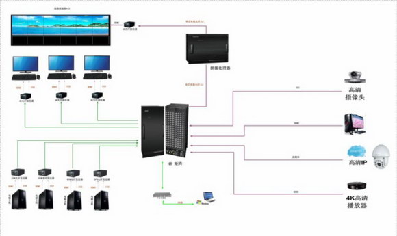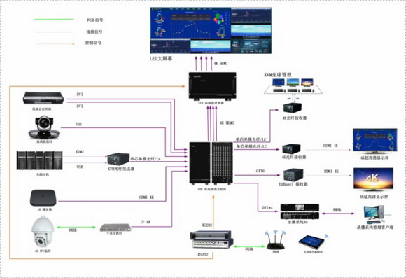 整個系統建設以系統工程、信息工程、自動化控制等理論為指導,把4k信號傳輸切換,4k無縫拼接技術、多終端共享技術、4k網絡視頻通訊技術等科技手段的應用綜合為一體,形成一個真正無縫拼接,擁有高對比度、畫面清晰流暢、高灰階度,高刷新,技術先進、功能強大、便于臨場指揮、果斷決策、多媒體展示,視頻會議,互動體驗于一體的高科技4k音視頻指揮系統。
