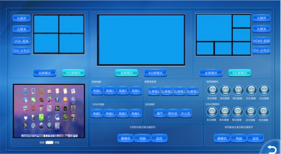 在指揮中心內需要集中對電視,DVD,攝像機,會議音量等集中的控制,可以快速的調用大屏顯示模式,并且隨時調度相關的視頻到大屏顯示。根據用戶的使用習慣,編輯存儲多種使用場景,便于一鍵調用快速進入應用狀態。