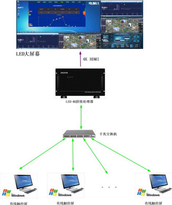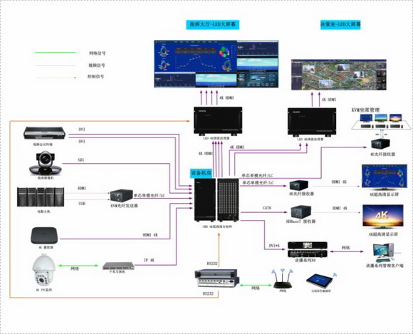 關于應急指揮中心的音視頻切換,傳輸和KVM功能,采用CREATOR的4K拼接處理器結合UHD 4K矩陣搭配周邊的發送接收模塊等來實現的4k信號的接入,傳輸,切換,拼接等。