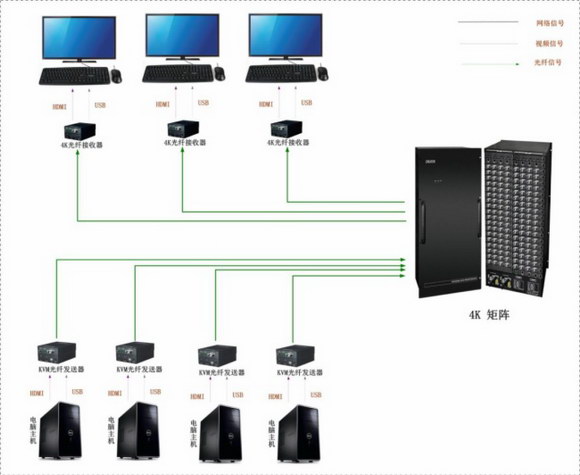 系統大部分的視頻源服務器,計算機和一部分業務網服務器都集中在機房統一部署運行。這些設備(服務器)通過各個光纖信號接入矩陣光纖輸入板卡,實現操作席遠程對服務器的業務辦公和操控。