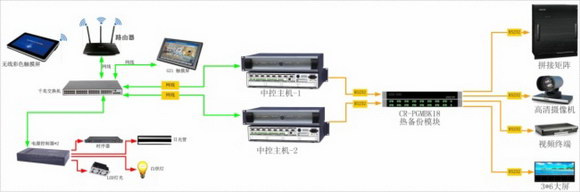 支持全網絡雙機熱備份控制,主中控出現故障,觸摸屏自動連接至備份中控,系統繼續穩定運行并且。兩臺主備中控的輸出232指令同時輸出至熱備份模塊,熱備份模塊輸出至受控設備。