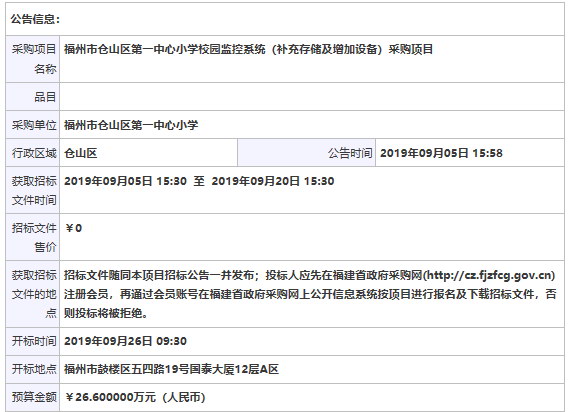 福州市倉山區第一中心小學校園監控系統(補充存儲及增加設備)采購項目招標公告