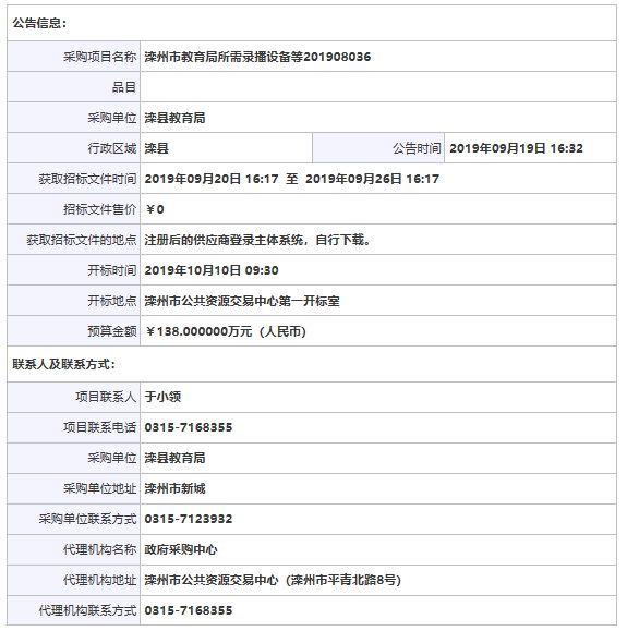 采購項目名稱: 灤州市教育局所需錄播設備等201908036