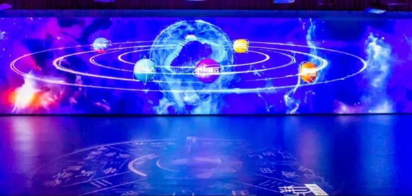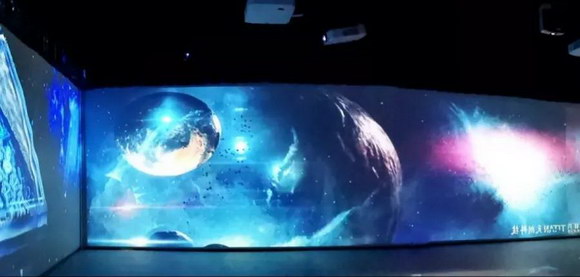 展示中心的360°沉浸式展廳的畫面分別由4個立面與地面組成,構建出逼真而清晰的立體環境,每個立面寬22米,地面面積達484平方米。為了打造高質量的感官視界,最終選用40臺NEC PA653UL+液晶激光工程投影機,以水平吊裝正投(墻面投影)+垂直安裝(地面投影)方式投射,環顧四周產生超視野畫面,讓觀眾在高質量的聲音與高清畫面環境包圍之中,產生身臨其境的強烈現場感和沉浸感。