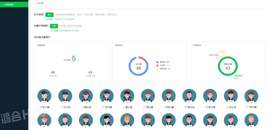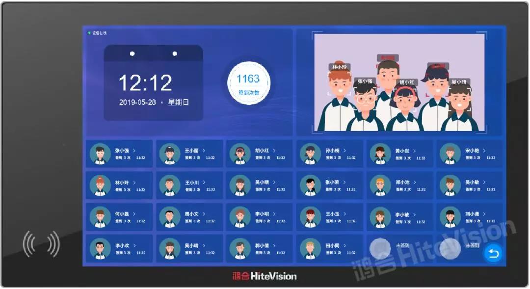 新一代鴻合電子班牌采用先進的人臉識別技術,讓AI人臉簽到成為現實。操作便捷,提前采集好學生照片,課前,學生點擊左下角簽到圖標,在班牌前進行刷臉簽到,簽到成功后會在最后一行展示頭像及簽到時間,并在簽到成功后給出提示信息。此外,鴻合電子班牌還支持多名學生在無遮擋情況下同時刷臉簽到成功。