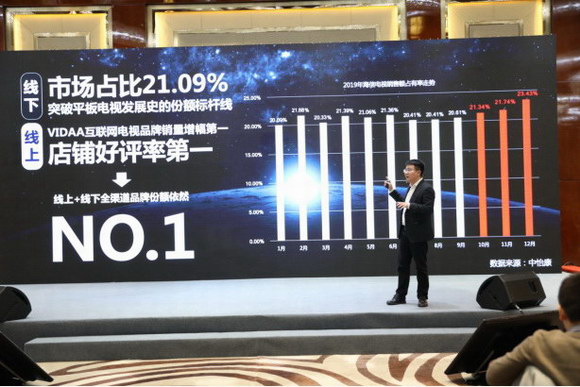 雖然近十幾年來,海信電視一直居市場榜首,但2019年,這個第一又被賦予了新的意義。根據(jù)中怡康數(shù)據(jù),2019年的12個月,海信電視線下銷售額占有率全部超過了20%,全年達(dá)到21.09%。這是中國平板電視興起20年來,第一次有品牌超越20%。此外,海信2019年發(fā)布的全新互聯(lián)網(wǎng)電視品牌VIDAA,當(dāng)年就拿到了互聯(lián)網(wǎng)電視品牌銷量增幅第一和店鋪好評率第一。