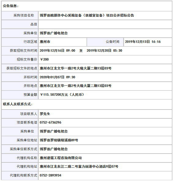 博羅縣融媒體中心采編設備(錄播室設備)項目公開招標公告