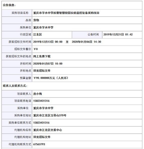重慶市字水中學(xué)所需智慧校園安防監(jiān)控設(shè)備采購項目(19A0669)采購公告