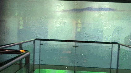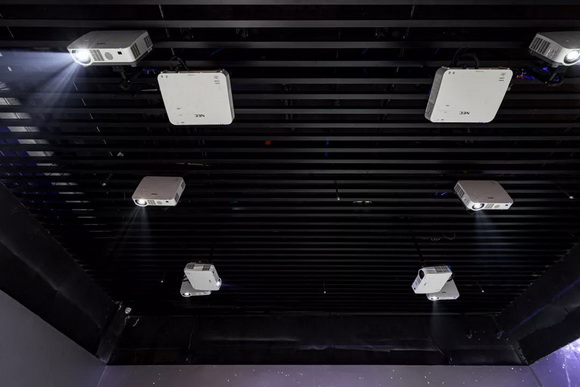 步入展廳,最炫酷的非“360°體驗沉浸式投影”莫屬。該展項采用了6臺NEC高端液晶激光工程投影機PA653UL+與6臺DLP激光投影機P502HL+,分別在前、左、右三面墻體以及地面呈現影像,墻面顯示范圍高3.5米,其中兩面寬7米、一面寬8.3米,地面顯示面積達58平米,超大顯示面積將賓客包圍在其中,實現全視角覆蓋,故為360°沉浸式體驗。