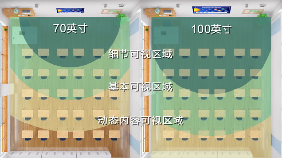 一般學(xué)校的教室在50~100平米左右,有研究表明,70英寸的顯示畫面不足以讓教室內(nèi)所有學(xué)生都處在最大可視范圍內(nèi),100英寸的顯示畫面可以讓教室內(nèi)所有學(xué)生都處在最大可視范圍內(nèi)*1。
