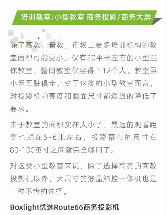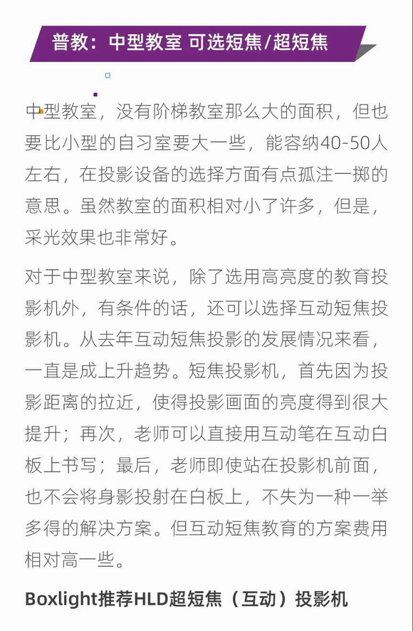 值得一提的是,有些大型培訓機構如學而思,教室面積基本跟普教大小相近,環境比較明亮,學生上課用眼時間長,需要考慮用眼健康,老師板書內容比較多,并且需要考慮遮擋、光源壽命、維修等多種問題,綜合而言,Boxlight打造的HLD超短焦互動投影機,HLD超短焦0.27~0.29:1的投射比,有效的避免了遮擋問題;HLD光源更為安全、長效,HLD是高密度LED光源,具有普適性,具有更高的安全等級。而Boxlight寶視來為學而思優先的HLD超短焦投影機具有4200流明亮度,即使明亮的教室環境里也能投清晰亮麗的畫面,而WUXGA的分辨率畫質細膩,文字清楚,投100寸畫面,更加護眼。